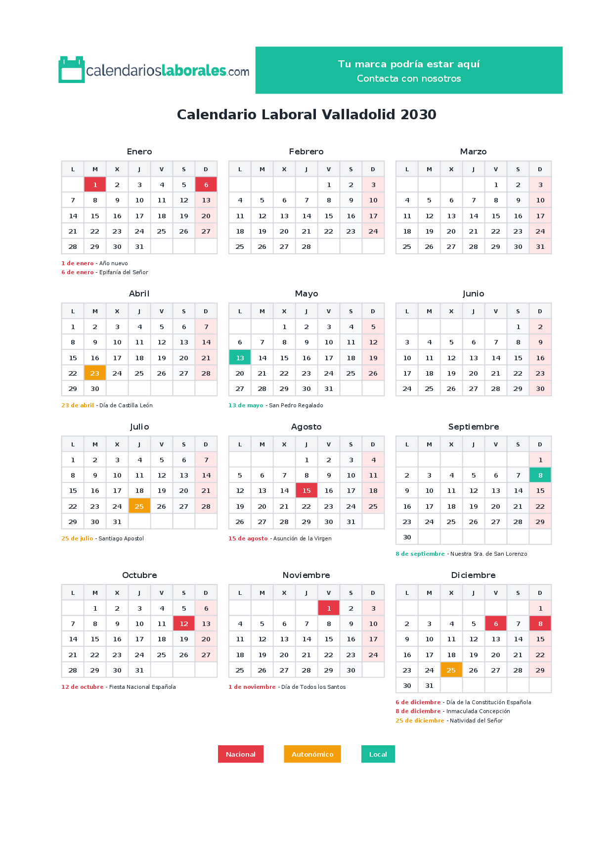 El calendario laboral de Valladolid en 2030 cuenta con un total de 12 días festivos, que incluyen festivos nacionales, festivos autonómicos de Castilla León y los festivos locales establecidos por cada municipio.