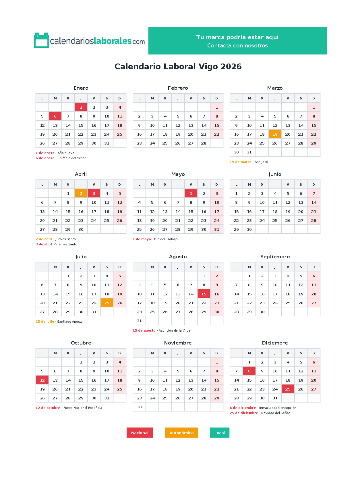 Además, el Ayuntamiento de Vigo fija 0 festivos locales que completan el calendario laboral del municipio.