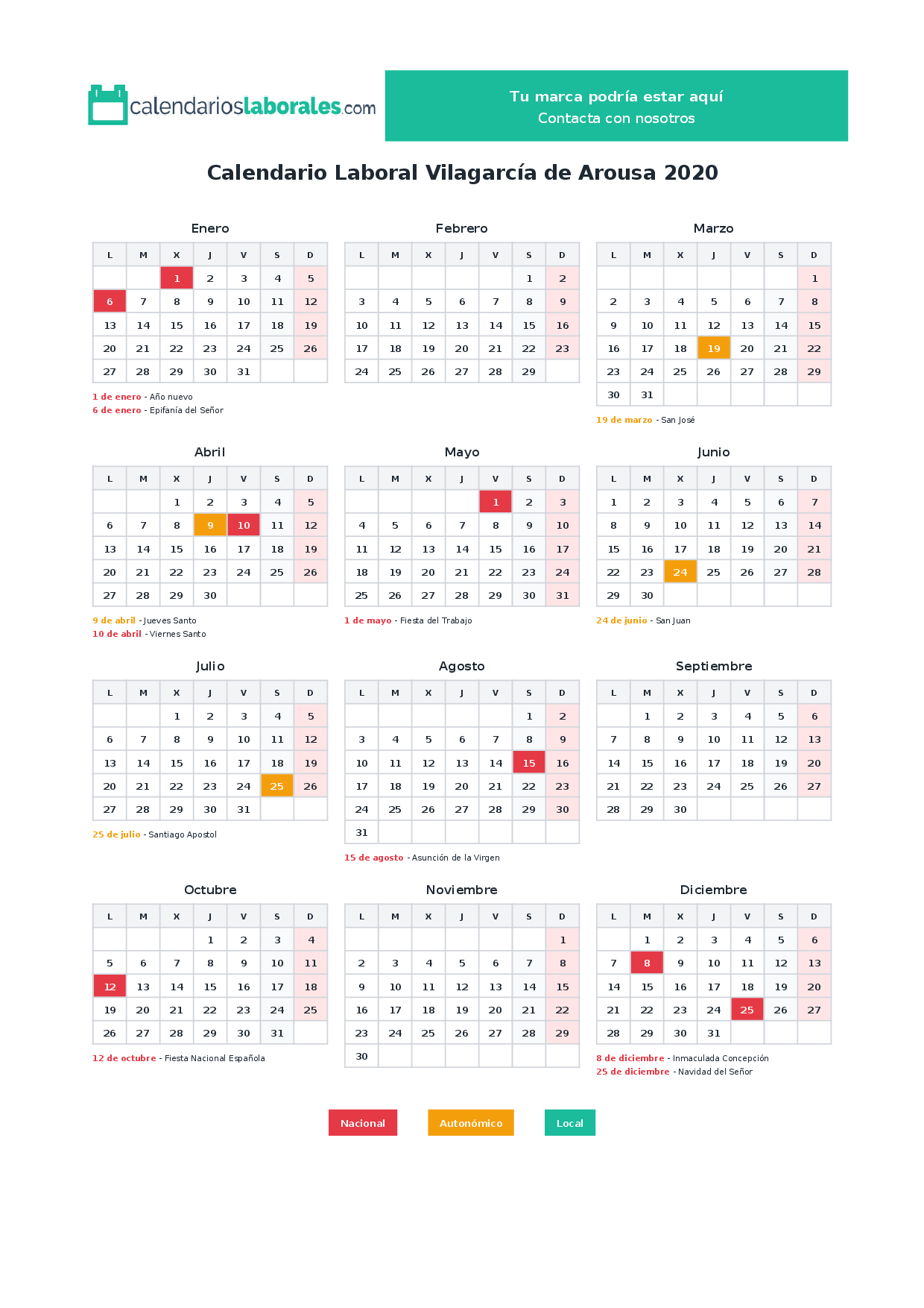 En 2020, 8 festivos nacionales se celebran en todo el territorio español, incluidos en el calendario laboral de Vilagarcía de Arousa.