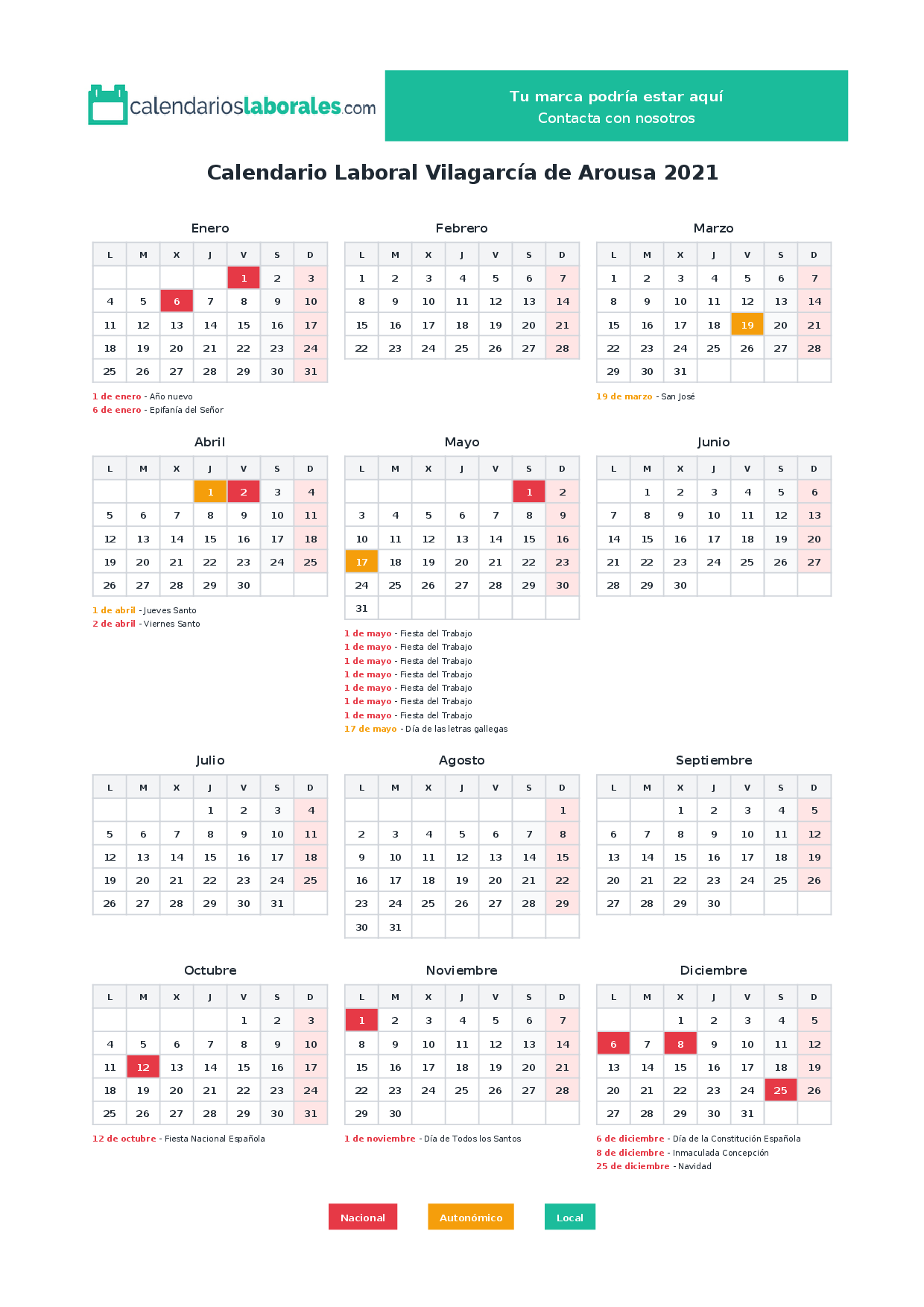 Calendario laboral Vilagarcía de Arousa 2021