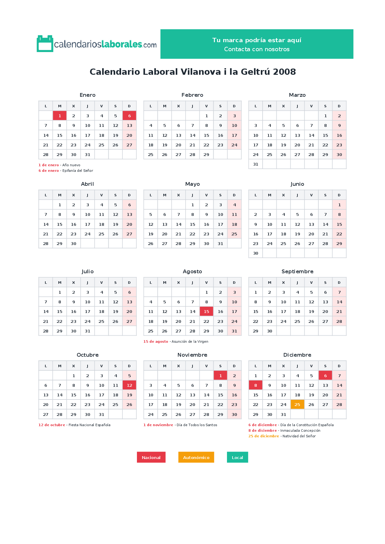 En 2008, 7 festivos nacionales se celebran en todo el territorio español, incluidos en el calendario laboral de Vilanova i la Geltrú.