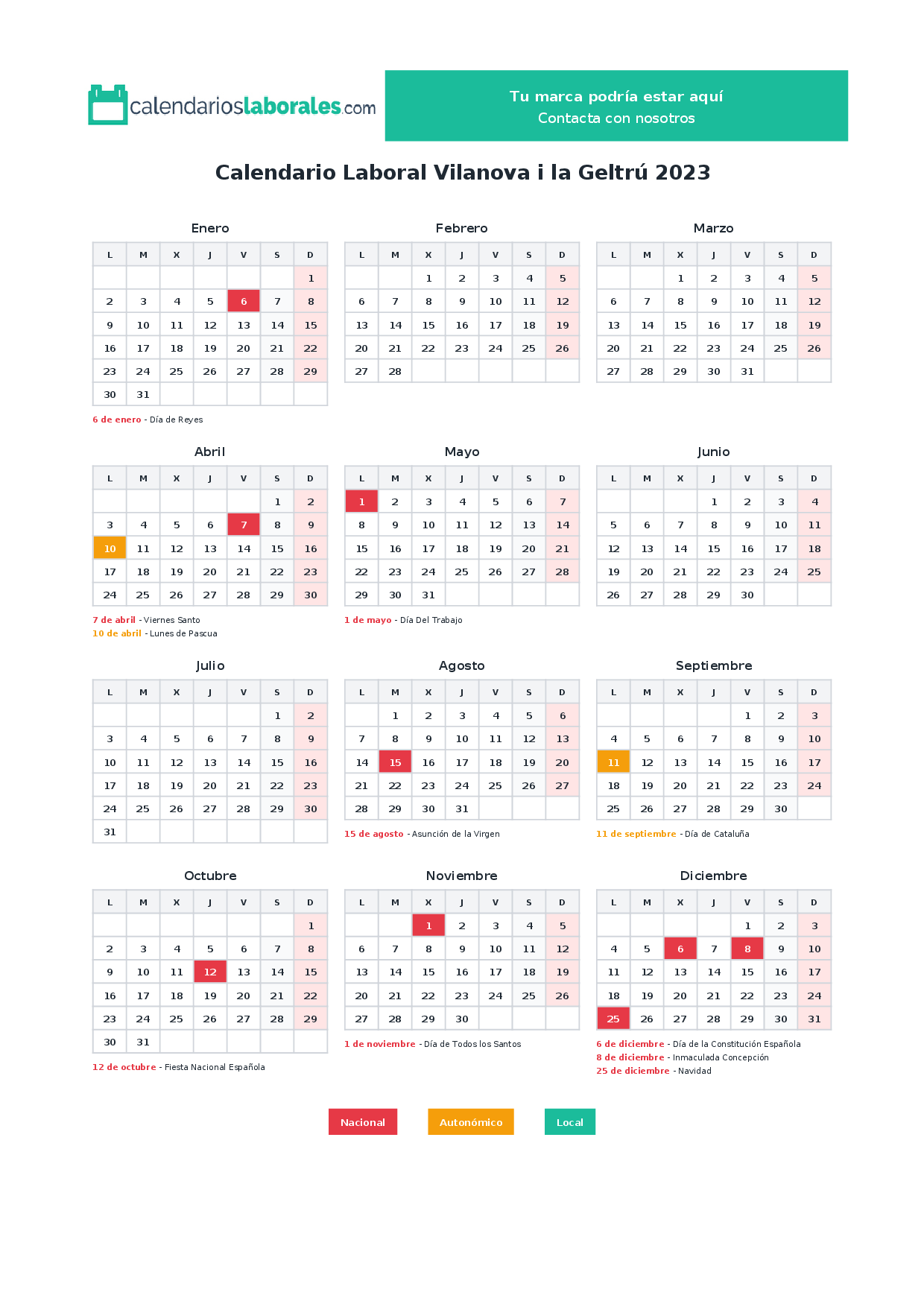 Calendario laboral Vilanova i la Geltrú 2023