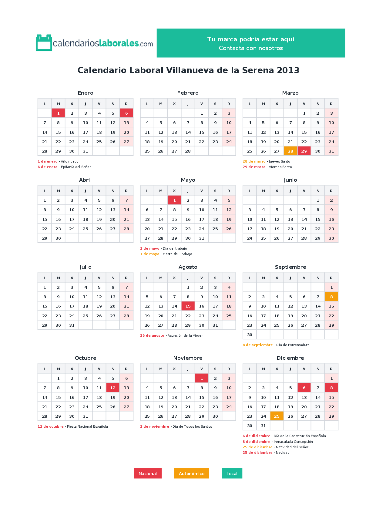 Calendario laboral Villanueva de la Serena 2013