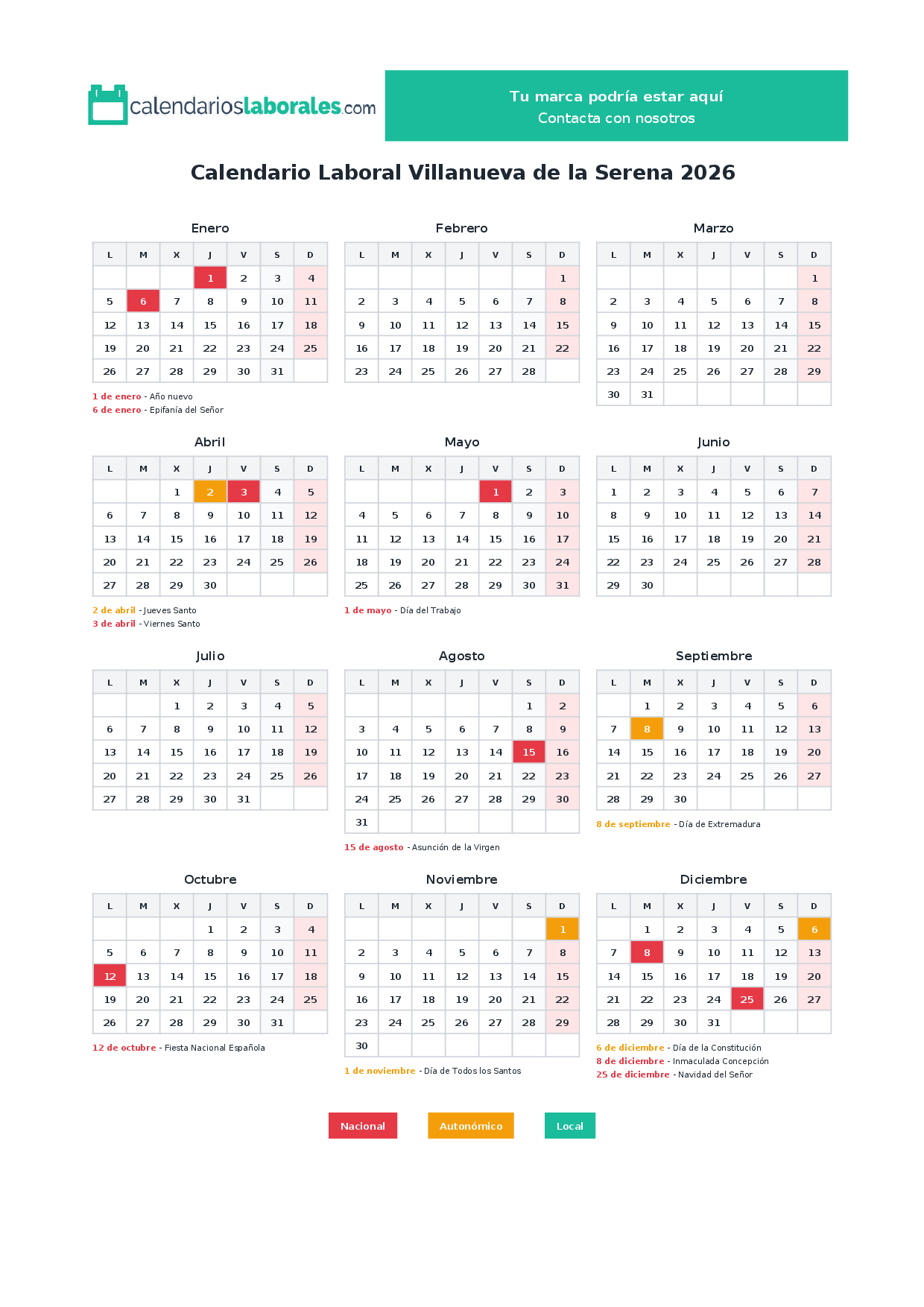 Calendario laboral Villanueva de la Serena 2026