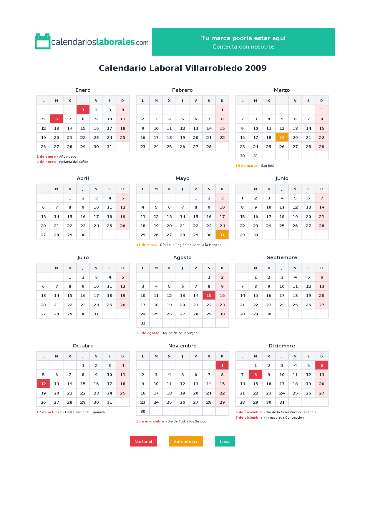 En 2009, 7 festivos nacionales se celebran en todo el territorio español, incluidos en el calendario laboral de Villarrobledo.