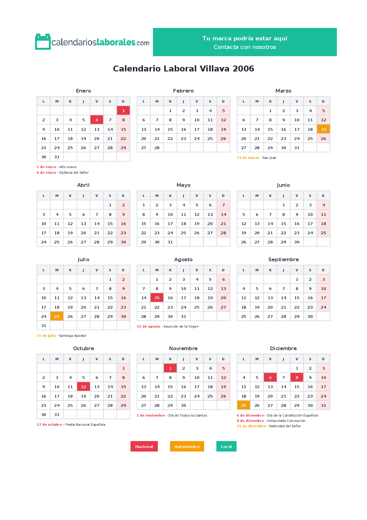 En 2006, 7 festivos nacionales se celebran en todo el territorio español, incluidos en el calendario laboral de Villava.