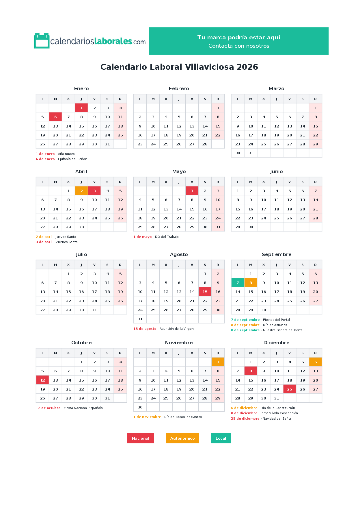 El calendario laboral de Villaviciosa en 2026 incluye un total de 13 días festivos, que combinan festivos nacionales, festivos autonómicos de Asturias y los festivos locales propios del municipio.