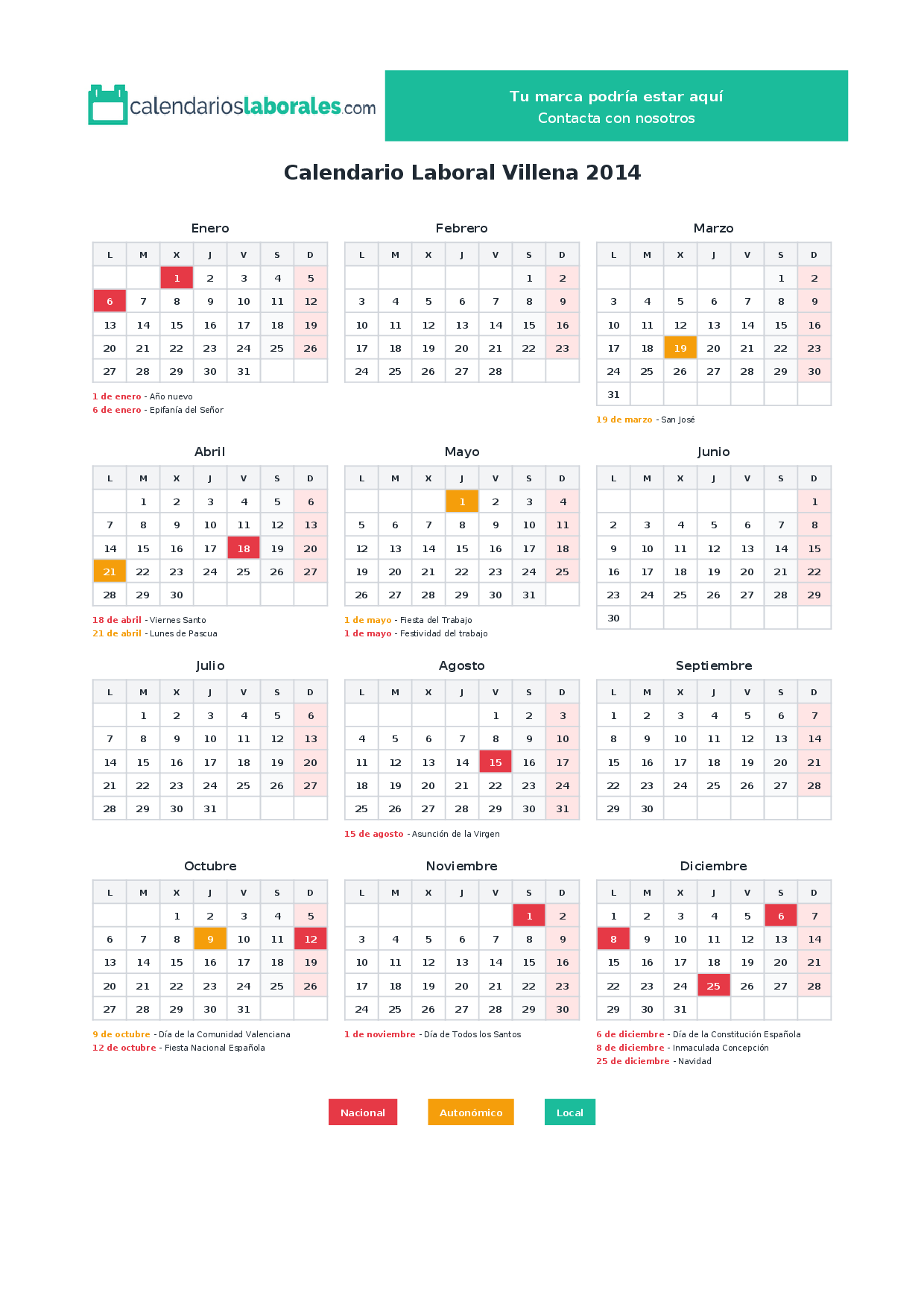 En 2014, 10 festivos nacionales se celebran en todo el territorio español, incluidos en el calendario laboral de Villena.