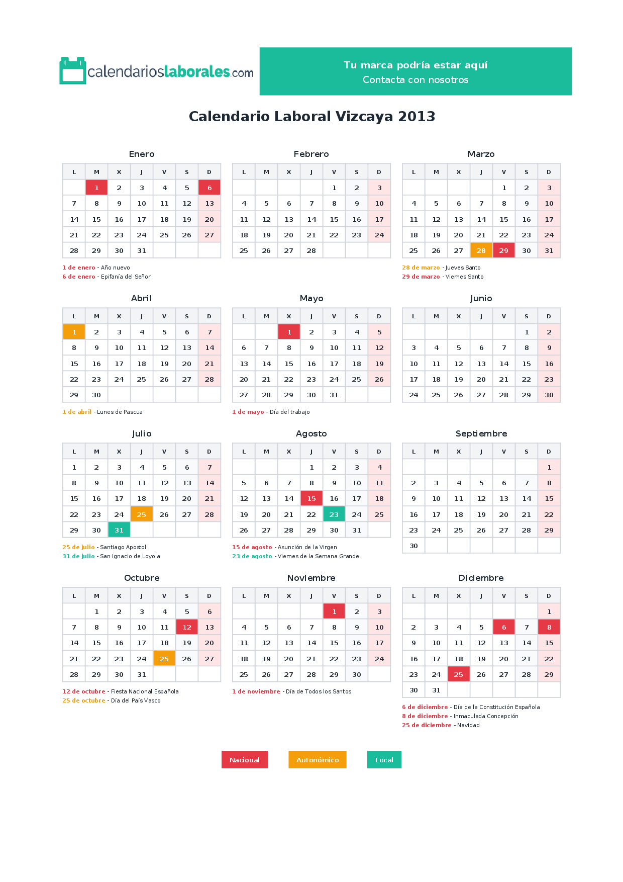 Calendario laboral Vizcaya 2013