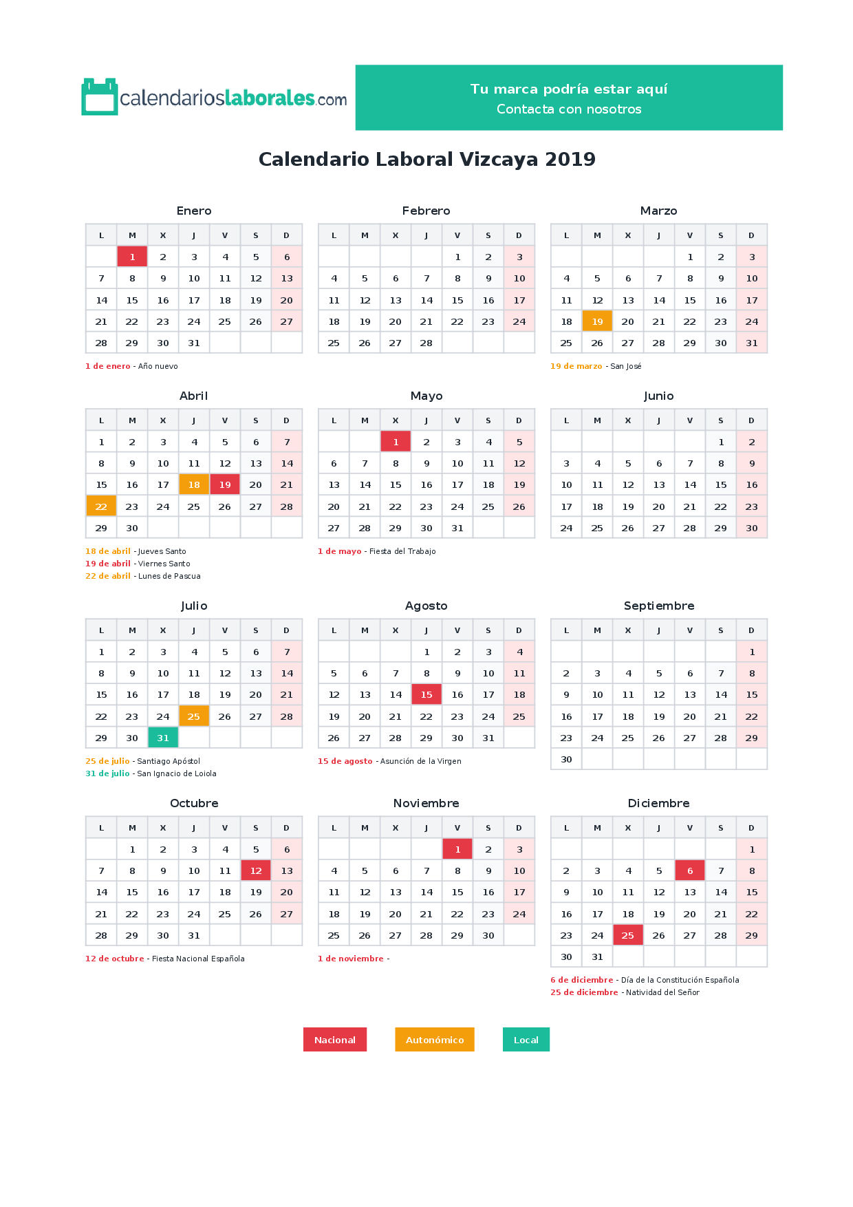 Calendario laboral Vizcaya 2019