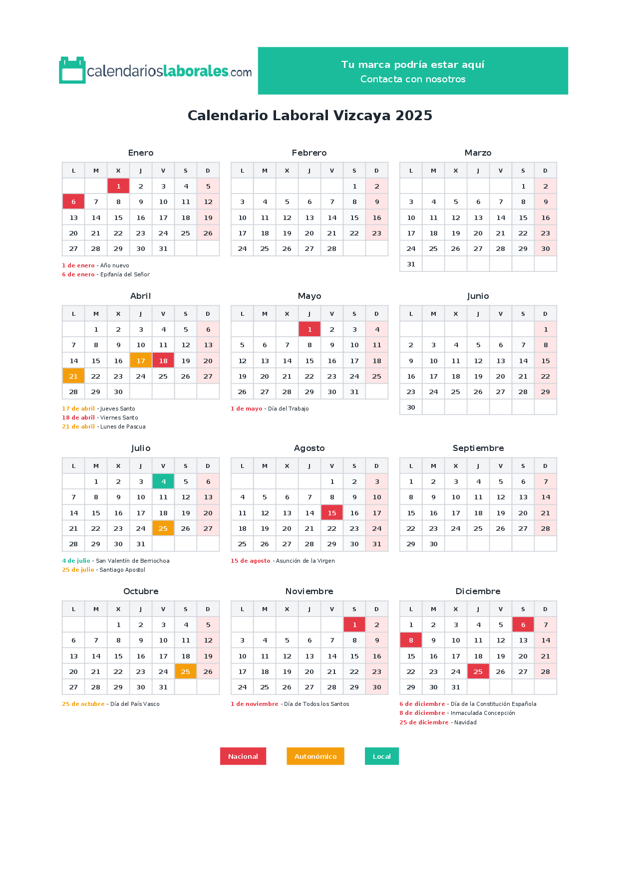 El calendario laboral de Vizcaya en 2025 cuenta con un total de 14 días festivos, que incluyen festivos nacionales, festivos autonómicos de País Vasco y los festivos locales establecidos por cada municipio.