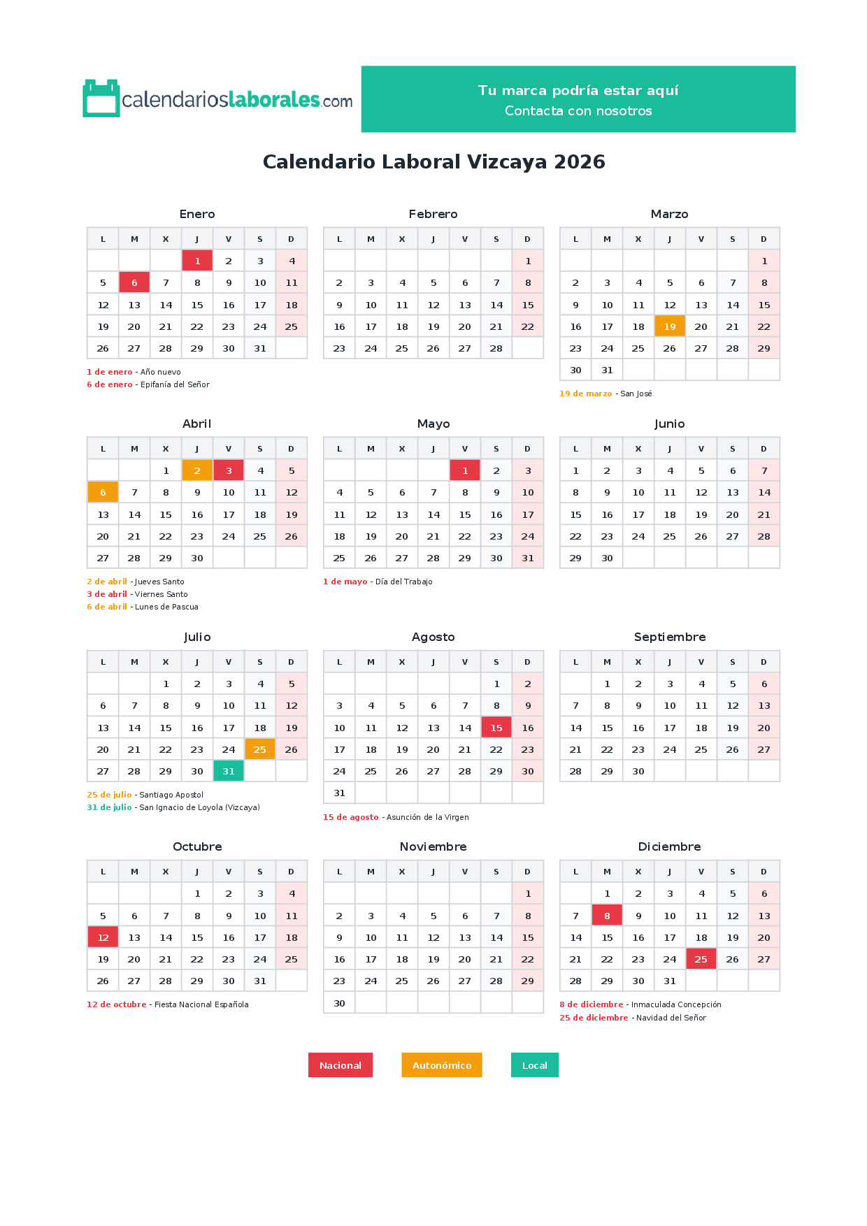El calendario laboral de Vizcaya en 2026 cuenta con un total de 13 días festivos, que incluyen festivos nacionales, festivos autonómicos de País Vasco y los festivos locales establecidos por cada municipio.