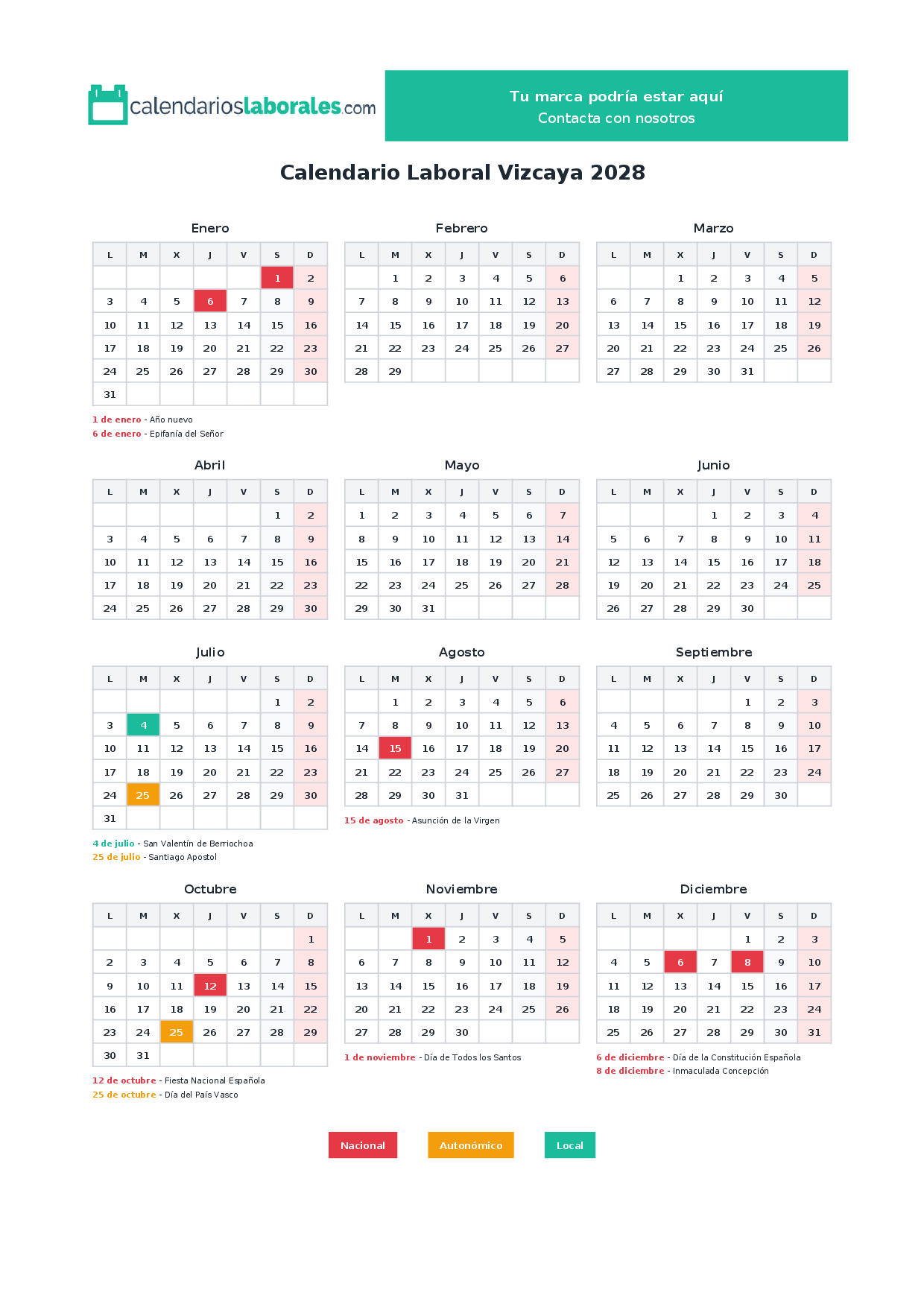 El calendario laboral de Vizcaya en 2028 cuenta con un total de 10 días festivos, que incluyen festivos nacionales, festivos autonómicos de País Vasco y los festivos locales establecidos por cada municipio.