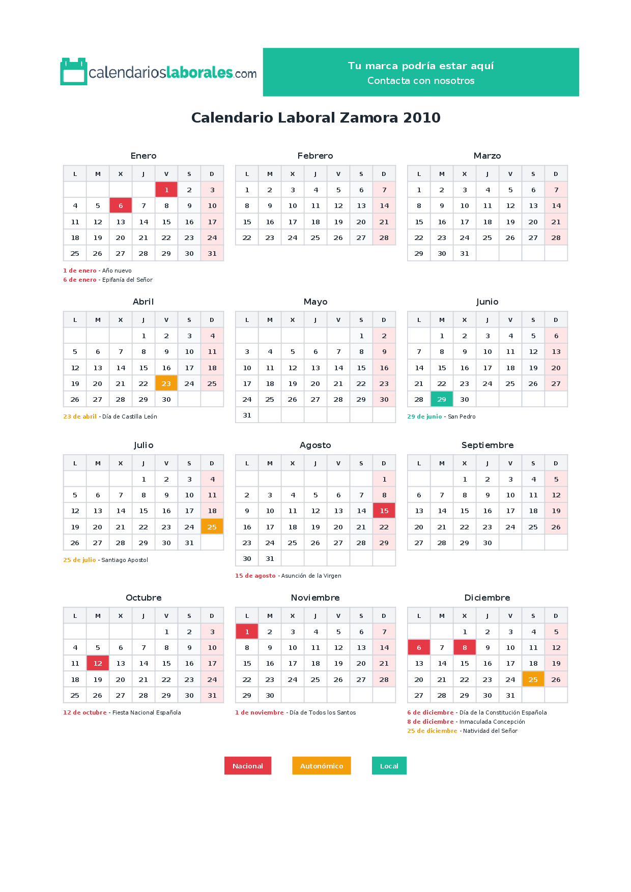 El calendario laboral de Zamora en 2010 cuenta con un total de 11 días festivos, que incluyen festivos nacionales, festivos autonómicos de Castilla León y los festivos locales establecidos por cada municipio.