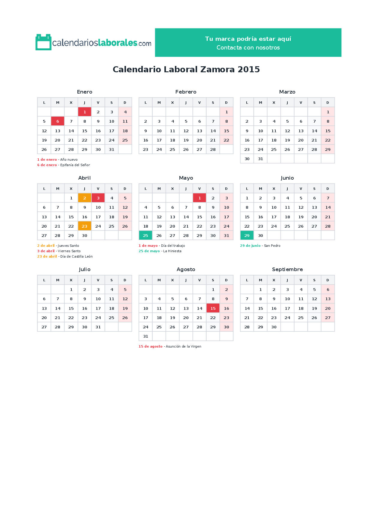 El calendario laboral de Zamora en 2015 cuenta con un total de 14 días festivos, que incluyen festivos nacionales, festivos autonómicos de Castilla León y los festivos locales establecidos por cada municipio.