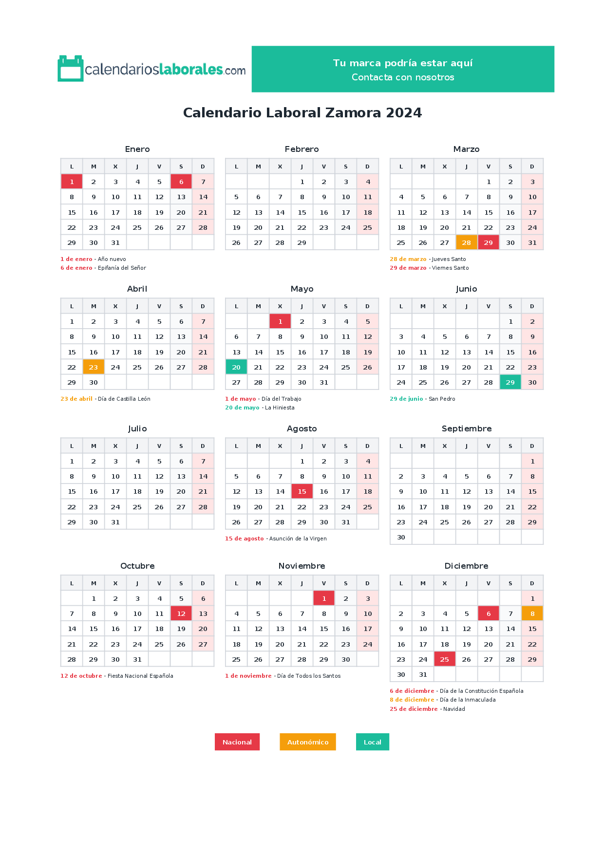 El calendario laboral de Zamora en 2024 cuenta con un total de 14 días festivos, que incluyen festivos nacionales, festivos autonómicos de Castilla León y los festivos locales establecidos por cada municipio.