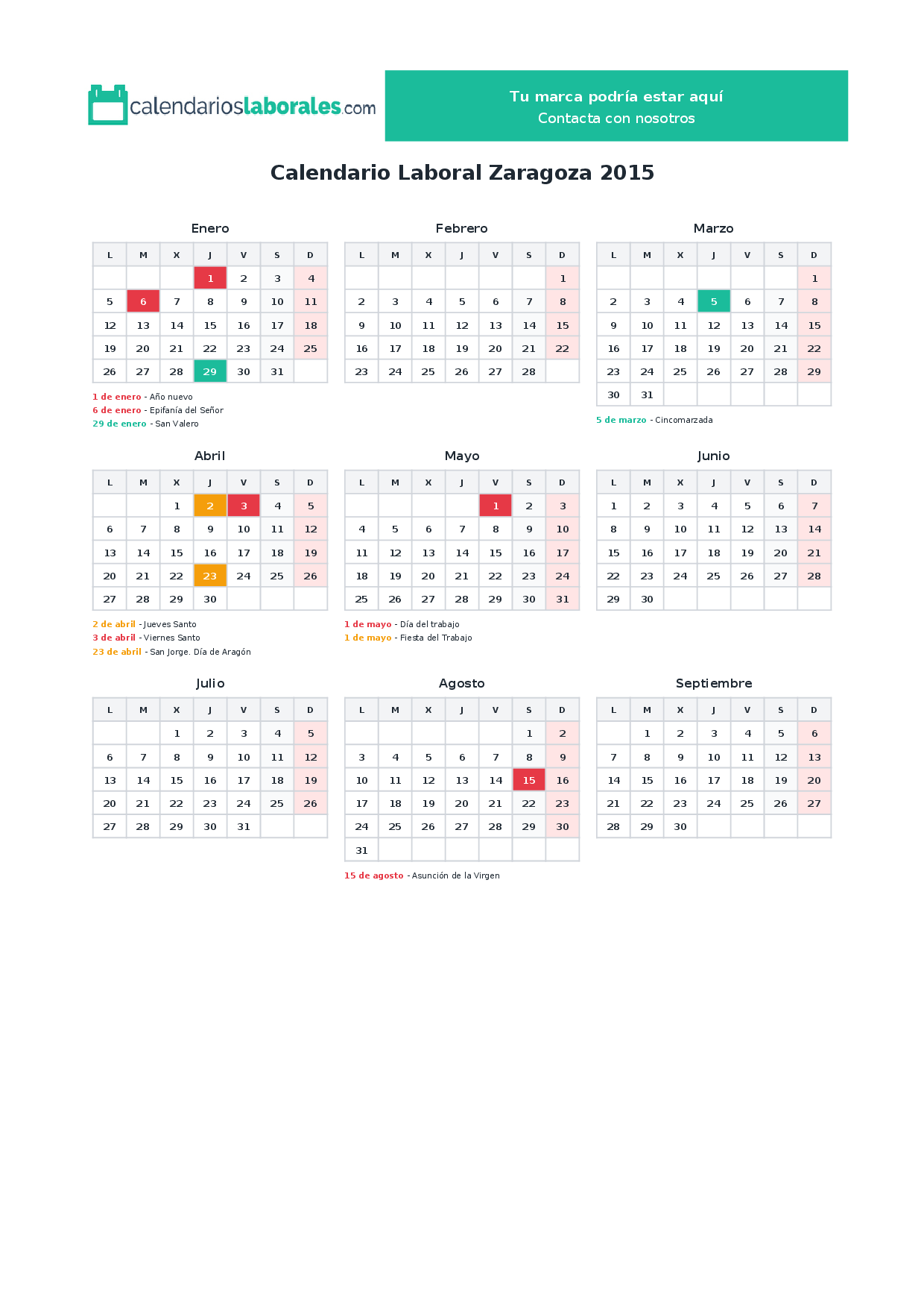 El calendario laboral de Zaragoza en 2015 cuenta con un total de 14 días festivos, que incluyen festivos nacionales, festivos autonómicos de Aragón y los festivos locales establecidos por cada municipio.
