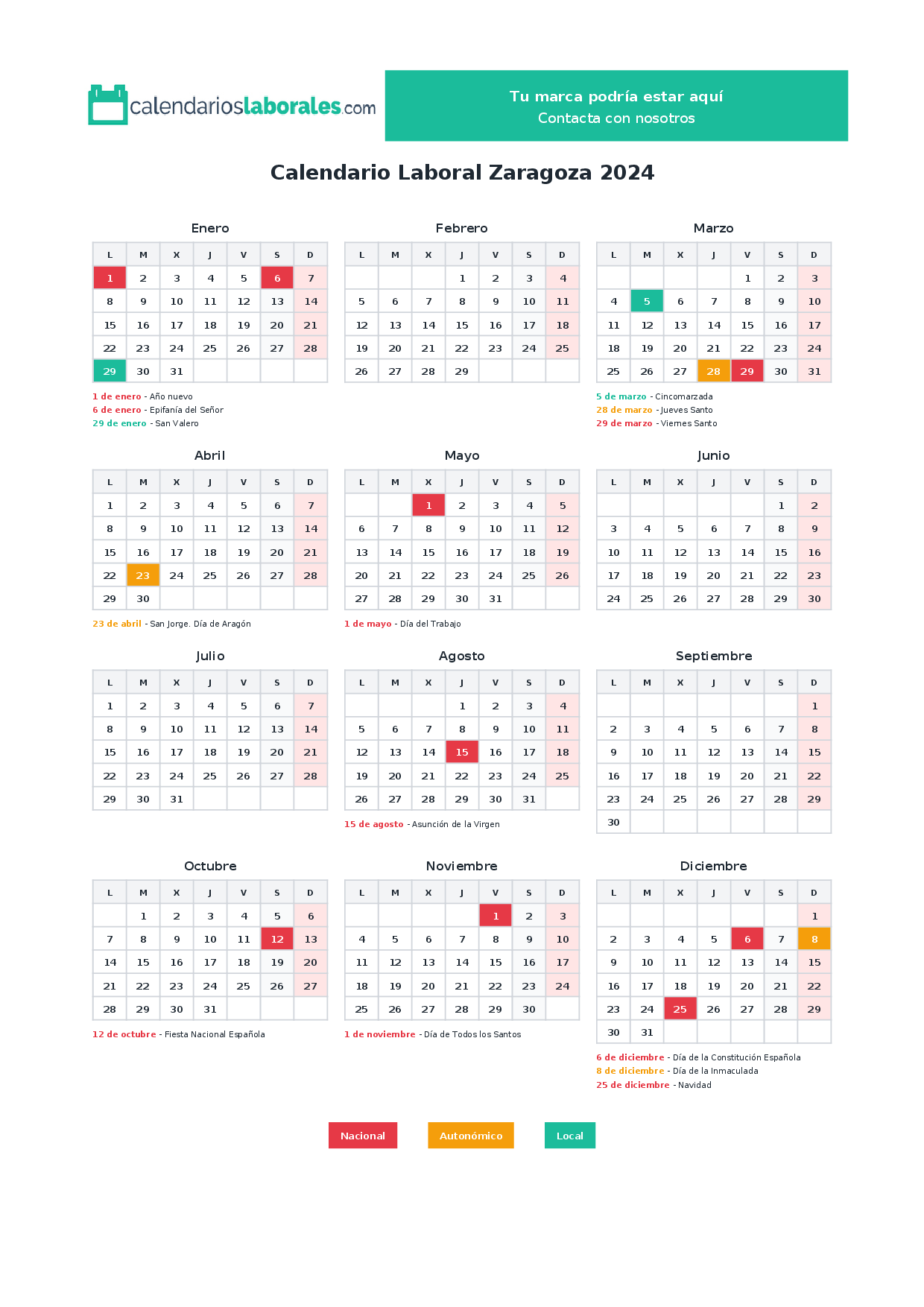 El calendario laboral de Zaragoza en 2024 cuenta con un total de 14 días festivos, que incluyen festivos nacionales, festivos autonómicos de Aragón y los festivos locales establecidos por cada municipio.