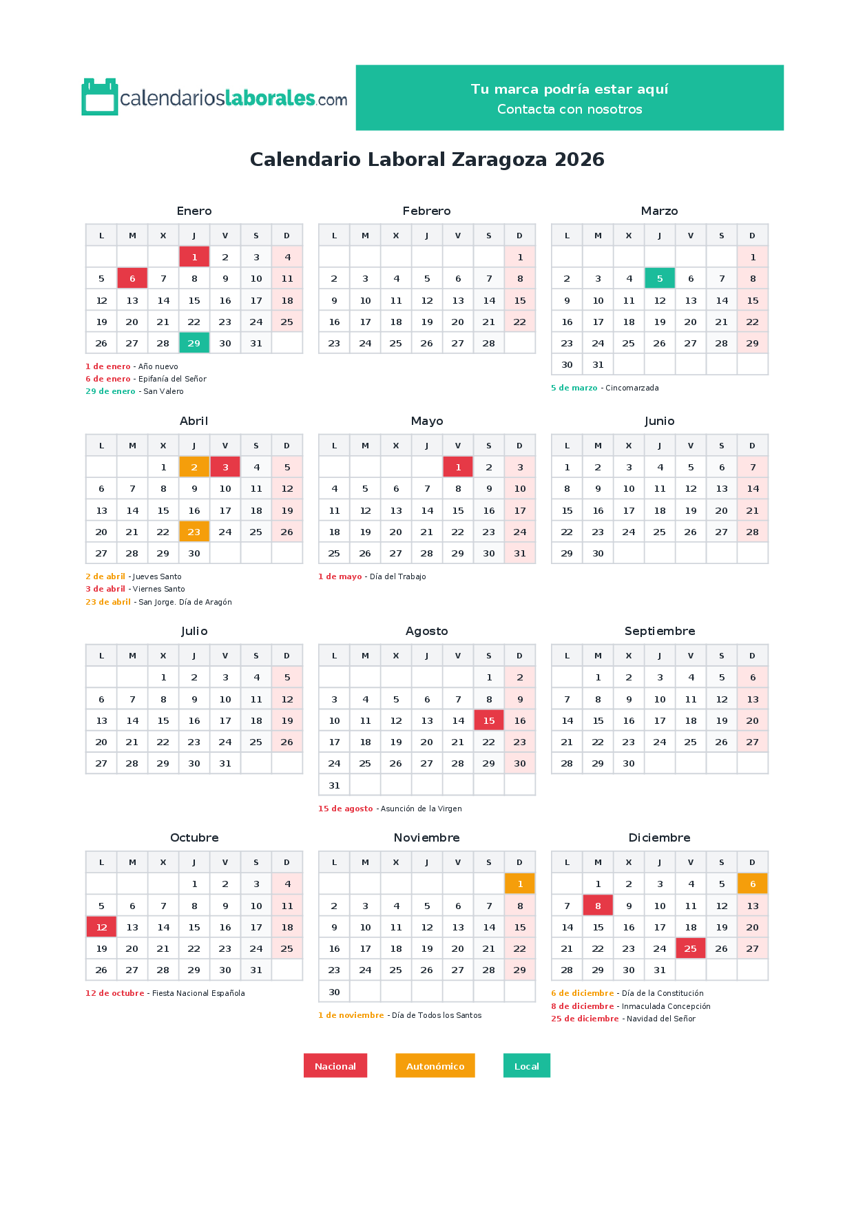 El calendario laboral de Zaragoza en 2026 cuenta con un total de 14 días festivos, que incluyen festivos nacionales, festivos autonómicos de Aragón y los festivos locales establecidos por cada municipio.
