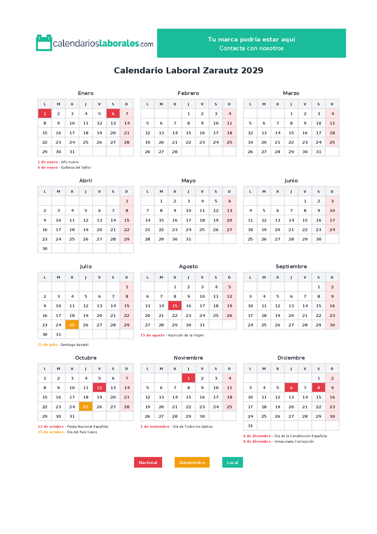 En 2029, 7 festivos nacionales se celebran en todo el territorio español, incluidos en el calendario laboral de Zarautz.